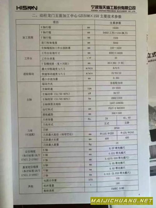 马上到工期、敢付钱的老板联系我!22年到厂海天15米动柱龙门加工中心,工作台4米*14米,BT50齿轮头,三轴行程15000*5400*1500。两立柱门宽5.3米,方滑枕500*500,带自动直角头,延长头。带光栅尺 发那科系统
